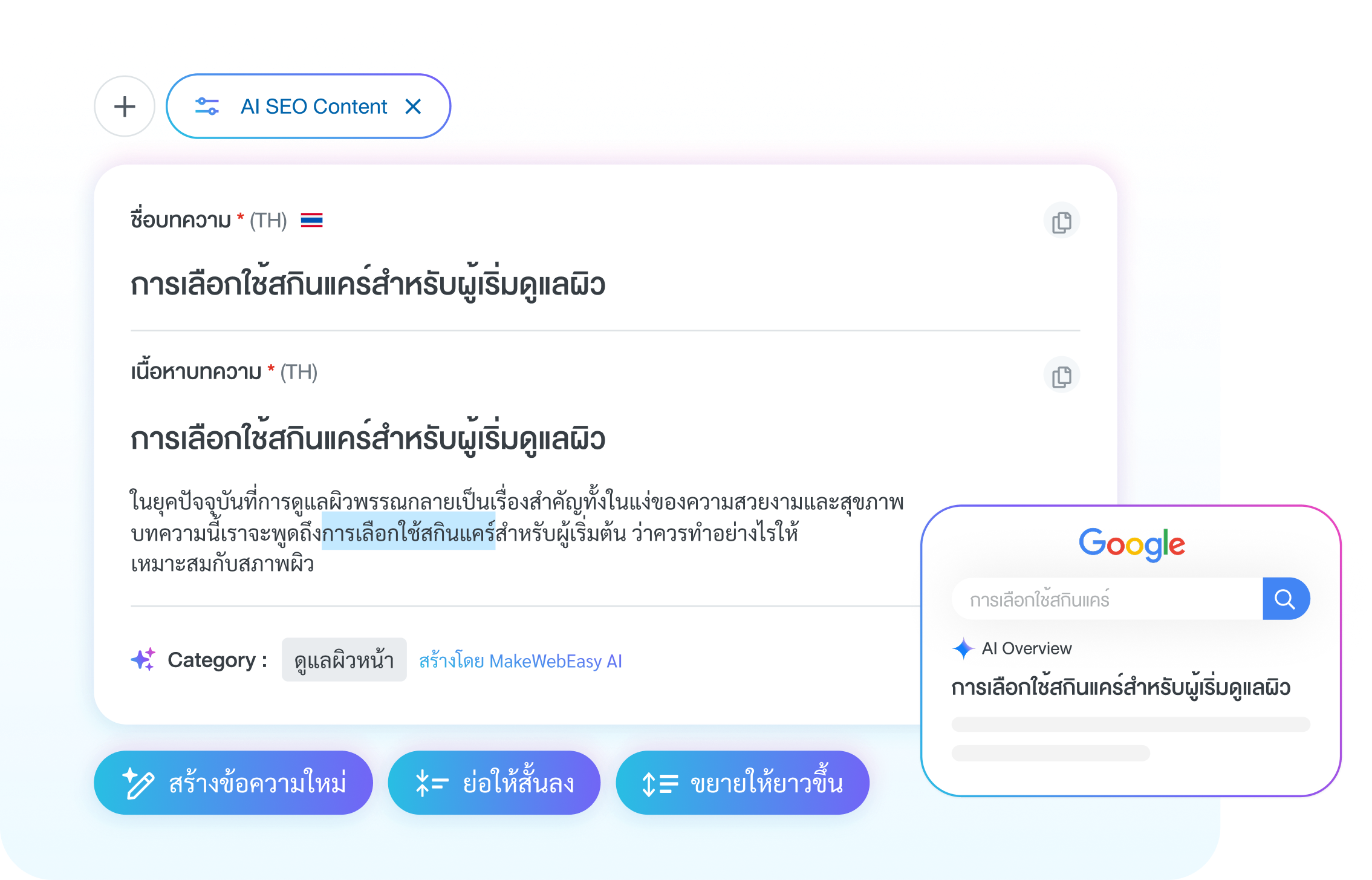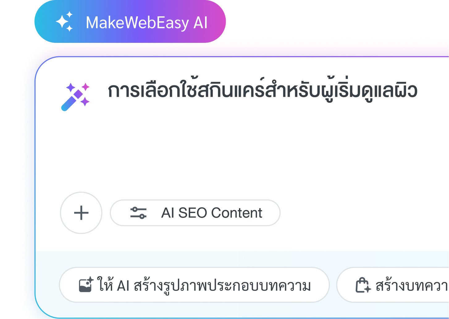 ให้ AI ช่วยคุณเขียนบทความ SEO คุณภาพ ถูกใจทั้งผู้อ่านและ Google ช่วยดึงกลุ่มเป้าหมายให้เข้า เว็บไซต์ได้อย่าง ต่อเนื่องเพิ่มโอกาสให้ธุรกิจของคุณ ถูกมองเห็น และค่อย ๆ เปลี่ยนผู้เข้าชมให้กลายเป็นลูกค้า