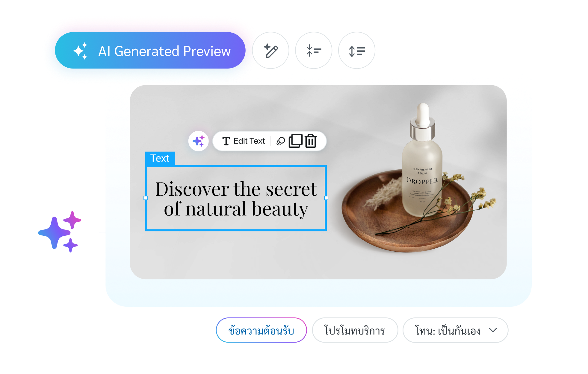 เปลี่ยนข้อมูลสินค้าธรรมดาให้กลายเป็นคอนเทนต์ที่เล่าเรื่องได้อย่างน่าสนใจ AI จะช่วยหยิบจุดเด่น ของสินค้าออกมาสื่อสารให้เข้าใจง่าย ตรงใจลูกค้า และช่วยกระตุ้นให้เกิดการตัดสินใจซื้อได้มากขึ้น